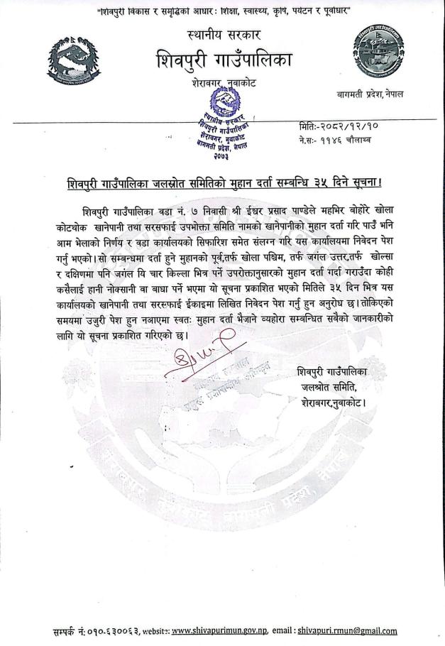 » शिवपुरी गाउँपालिका जलस्रोत समितिको मुहान दर्ता सम्बन्धि ३५ दिने सूचना