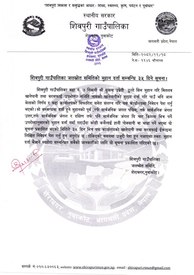 » शिवपुरी गाउँपालिका जलस्रोत समितिको मुहान दर्ता सम्बन्धि ३५ दिने सूचना