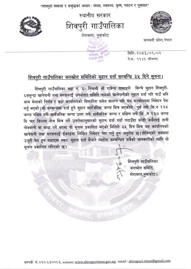 शिवपुरी गाउँपालिका जलस्रोत समितिको मुहान दर्ता सम्बन्धी ३५ दिने सूचना
