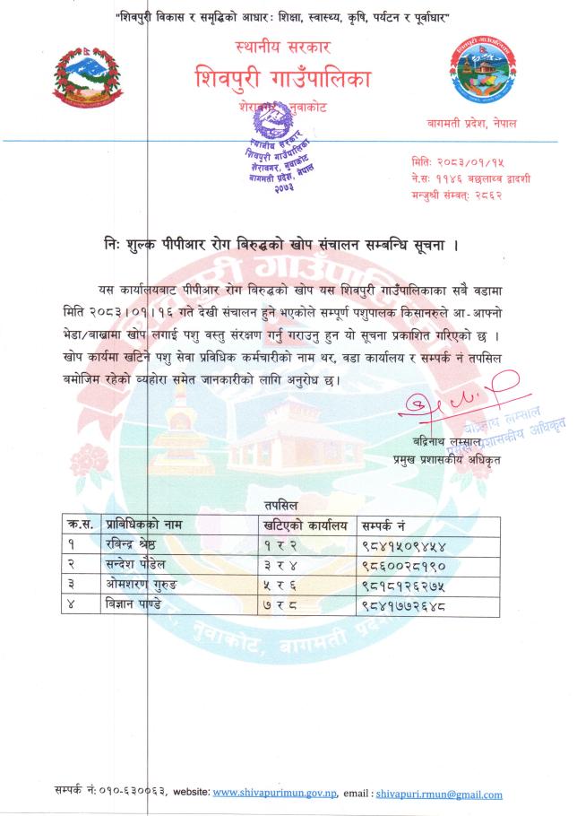 नि: शुल्क पीपीआर रोग बिरुद्धको खोप संचालन सम्बन्धि सूचना ।