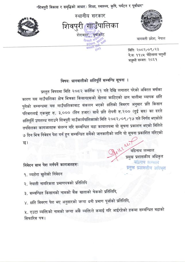 धानबालीको क्षतिपूर्ति सम्बन्धि सूचना
