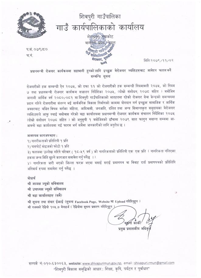 प्रधानमन्त्री रोजगार कार्यक्रममा सहाभागी हुनको लागि इच्छुक बेरोजगार व्यक्तिहरुबाट आवेदन फारम भर्ने सम्बन्धि सूचना