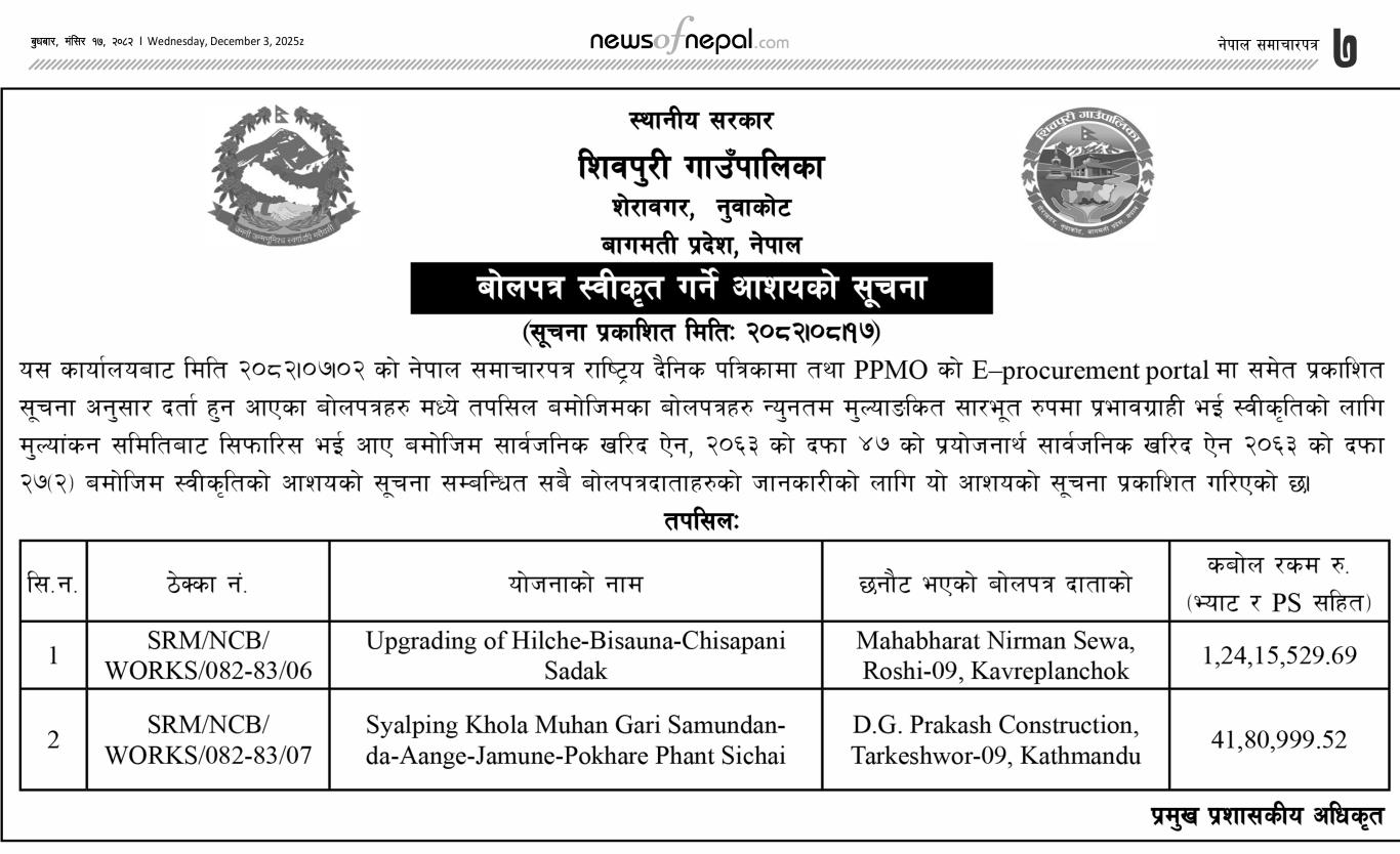 बोलपत्र स्वीकृत गर्ने आशयको सूचना