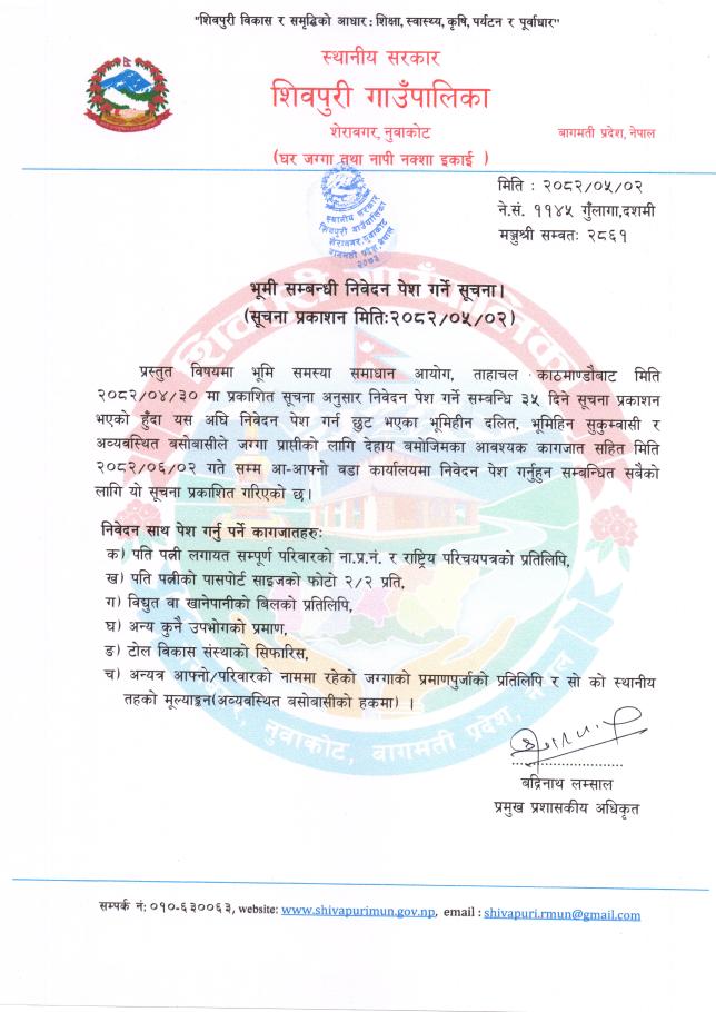 भूमि सम्बन्धि निवेदन पेश गर्ने सूचना