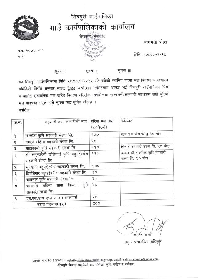 » युरिया मल बाँडफाँड सम्बन्धी सूचना