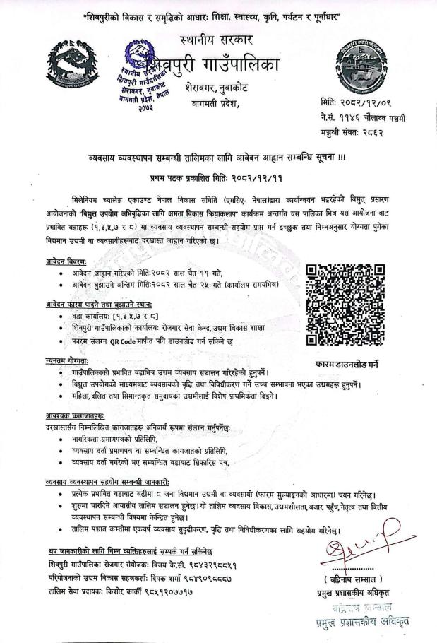 व्यवसाय व्यवस्थापन सम्बन्धी तालिमका लागि आवेदन आह्वान सम्बन्धि सूचना