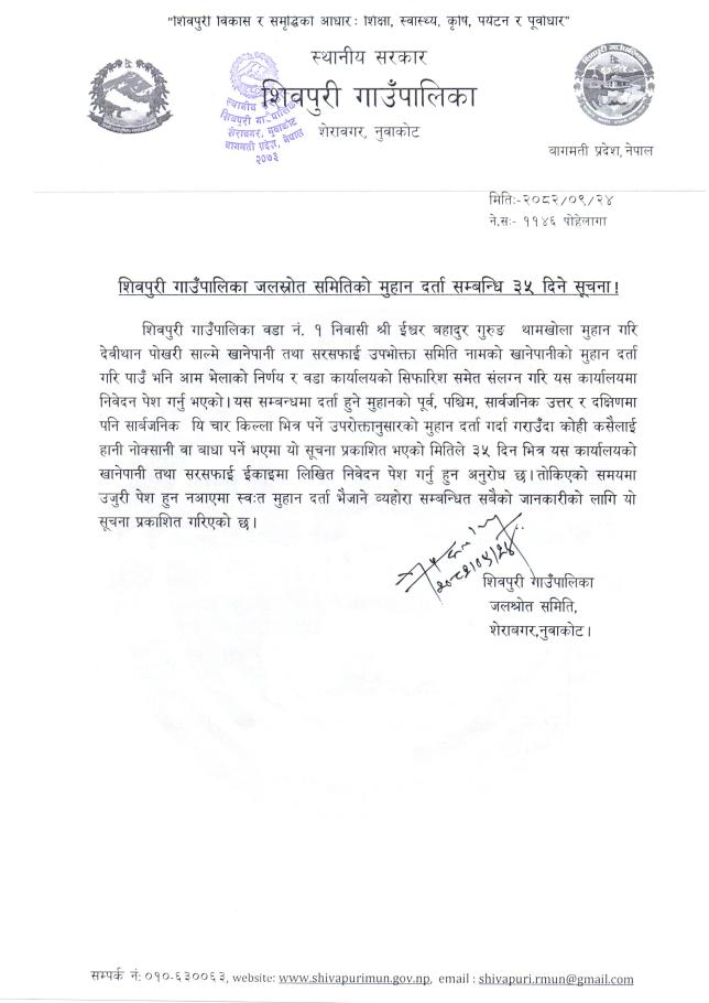 शिवपुरी गाउँपालिका जलस्रोत समितिको मुहान दर्ता सम्बन्धि ३५ दिने सूचना