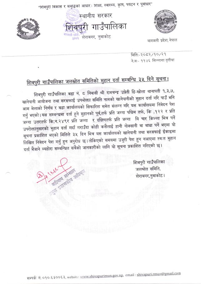 शिवपुरी गाउँपालिका जलस्रोत समितिको मुहान दर्ता सम्बन्धि ३५ दिने सूचना