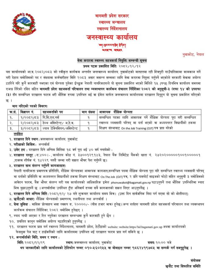 सेवा करारमा स्वास्थ्य सहजकर्ता नियुक्ति सम्बन्धी जनस्वास्थ्य कार्यालय सूचना
