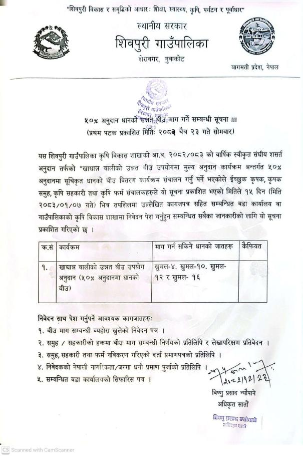 ५०% अनुदान धानको उन्नत बीउ माग गर्ने सम्बन्धी सूचना